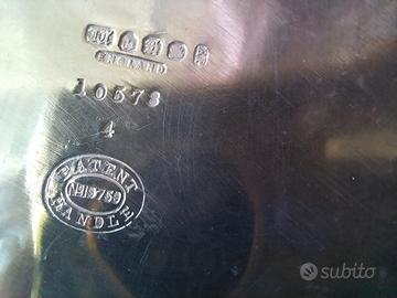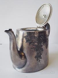 Teiera inglese antica placcata in argento Sheffield con motivi vegetali cesellati e maniglia brevettata. Nella punzonatura il marchio di Walker & Hall di Sheffield.