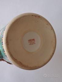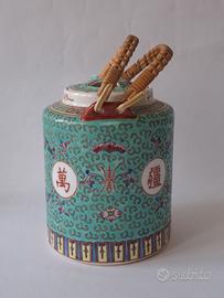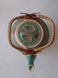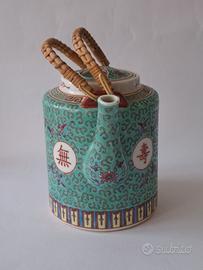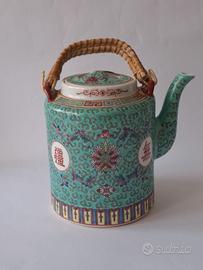 Bellissima teiera cinese Mun Shou in porcellana, con manico di bamboo, risalente agli anni '50. In condizioni molto buone.