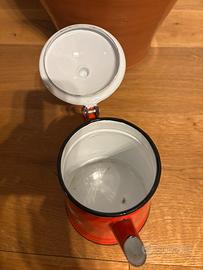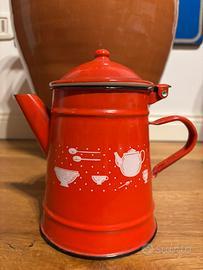 Teiera vintage in smalto rosso, con un grazioso motivo decorativo.