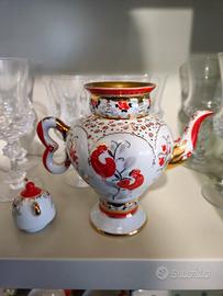 Teiera vintage in ceramica artigianale di provenienza russa con decorazioni dipinte a mano in stile tradizionale russo/est europeo.