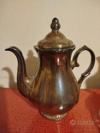 Teiera vintage in ceramica o porcellana con finitura metallica lustra, simile a modelli prodotti in Inghilterra o Germania nella metà del XX secolo. Forma bombata e ondulata, tipica degli oggetti decorativi d'epoca.