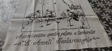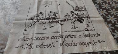 vendo tela di cotone degli anni 60 stampata da MARCHI dell' assicurazione sportiva pallone e tamburello L.Amati Santarcangelo, la tela misura 53 cm x 44 cm, adatta da incorniciare o x fare una tendina o uno strofinaccio, in buonissimo stato di conservazione per altre informazioni non esitate a contattarmi