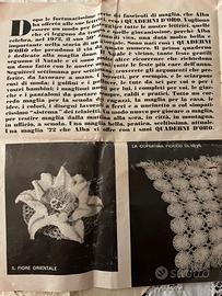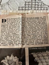 set vintage di telaietti per lavorazioni a lana o cotone, oggi conosciuti anche come Flower Loom, utilizzati nei primi anni ’70 per creare piccoli fiori e mattonelle decorative da unire tra loro per realizzare copertine, scialli, centrini e molti altri lavori fatti a mano. L’oggetto proviene dalla mia famiglia a Trieste, conservato con cura, ed è stato utilizzato da mia zia Annamaria (1922-2016), molto abile nei lavori femminili come ricamo, maglia e uncinetto. Dopo la morte precoce della madre, lei e le sue sorelle furono portate nel collegio di Santa Geltrude a Napoli, dove negli anni ’30 e ’40 le suore insegnavano ricamo, maglia e uncinetto e preparazione del corredo. All’epoca era molto importante avere un corredo ricco e ricamato a mano per il matrimonio. Mia zia ha conservato per tutta la vita questa capacità e ha continuato a realizzare lavori con grande precisione. I due telaietti rotondi conservano ancora le lavorazioni completate realizzate da mia zia Annamaria e verranno spediti così come visibili nelle fotografie. Questi piccoli telaietti raccontano una storia di pazienza e di lavoro fatto a mano, quando le ragazze imparavano a ricamare e lavorare la lana pensando al proprio corredo. Caratteristiche •set composto da 5 telaietti vintage •Flower Loom / Daisy Loom •metallo cromato •3 telaietti quadrati •2 telaietti rotondi •istruzioni originali rivista Alba – 1971 •lavorazioni già realizzate sui telaietti rotondi •normali segni del tempo Il set conserva anche il foglio originale di istruzioni tratto dalla rivista “Alba”, fascicolo annesso al numero 48 del 1971. Questo tipo di inserto spesso veniva separato o perso negli anni, per cui è interessante trovarlo ancora insieme agli strumenti.