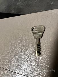 E' corredato dalla chiave originale e coeva che si vede in foto, che serve per aprire lo sportello anteriore, purtroppo quella della cassaforte non è presente, ma è reperibile la serratura completa in rete, quindi andrebbe sostituita da un abile fabbro, anche se personalmente non ne trovo la necessità.