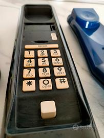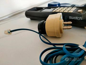 Telefono fisso Swatch Twin Phone Anno 1989 Dispositivo ADSL con spina tripolare Tastiera alfanumerica Cavo telefonico a spirale con struttura elastica a molla Cavo elettrico blu flessibile Lunghezza telefono 24 Larghezza telefono 7 Altezza telefono 8 Ottime condizioni