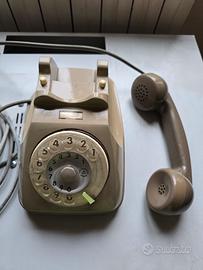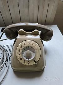 Un classico telefono da tavolo con finitura beige e disco combinatore. - Design retrò. - Cavo spiralato. - Pulsante di selezione.