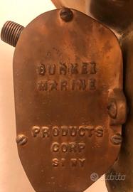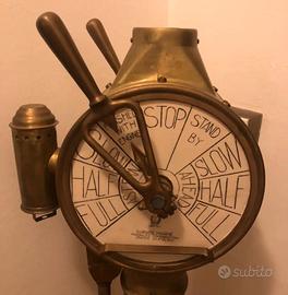 Telegrafo di macchina Durkee Marine (americano), in pesante ottone e bronzo, bi-faccia, restaurato con piatti in ceramica antichizzata, base in legno e lumino originale laterale. Ideale per vetrine, allestimenti negozi, ristoranti, locali a tema ecc., idea regalo natale, compleanno, laurea