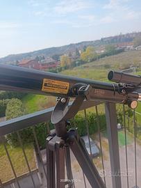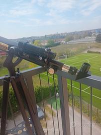 Apertura 60/700 di focale, fornito di 2 oculari da 35 e 58 ingrandimenti,cercatore 5x24 e prisma diagonale. Montatura alto azimut e treppiede in legno regolabile in altezza.