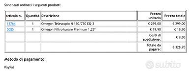 Vendo per acquisto errato un telescopio intatto mai montato mai aperto ( scatola aperta solo per verificare ci fosse tutto). Acquisto fatto su ASTROSHOP in Agosto 2024 ( fornisco su richiesta tutti i documenti attestanti l’acquisto). Compreso nel prezzo FILTRO LUNARE 1,25”.