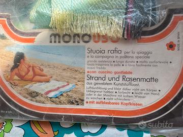 Telo stuoia da picnic / spiaggia in rafia multicolore a righe, con all’interno camera ad aria per gonfiare un cuscino.