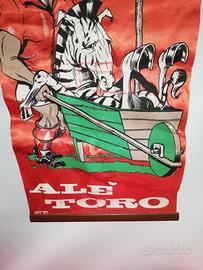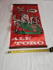 Telo in raso colore rosso, anni 80, raffigurante soggetti umoristici Toro/Juve, da appendere. Dim. Larghezza 26 cm e altezza cm 45. Buone condizioni, no fori, piccole mancanze di colore nella parte centrale. In basso a sinistra è presente la sigla/marca KLY. Spese a carico del destinatario.