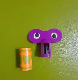 Temperamatite vintage a forma di chiavetta per carica a mano con occhi finti mobili, design and manifactured by Zoozoo Co. L.T.D., Made in Taiwan. I disegni del coperchio del temperino sono: cuore, orsetto, mela, farfalla. Raro.