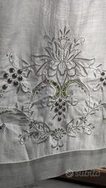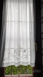 Tenda in lino finemente ricamata a mano.