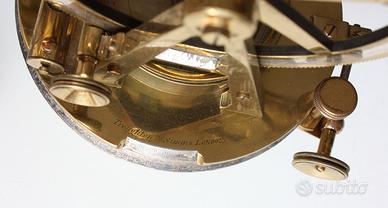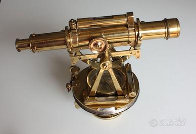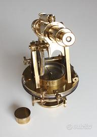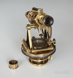 Antico teodolite in ottone realizzato da Troughton & Simms, con sede a Londra, nel 1840 circa. Per la regolazione nel piano verticale, lo strumento è dotato di quattro viti alla base. Una piastra circolare superiore in ottone del diametro di 13 cm, con due livelle (una è priva di liquido), è sovrapposta ad una piastra con scala goniometrica in gradi sessagesimali e doppio nonio di precisione. La regolazione del telescopio nel piano verticale viene fatta con una vite che agisce su una ruota a cremagliera a forma di semicerchio, avente doppia graduazione sessagesimale e sottostante nonio di precisione. Il telescopio consente una visione nitida e dispone in sommità di una livella; la messa a fuoco dell’immagine avviene con una vite che consente di variare la lunghezza del telescopio da un minimo di 26 cm ad un massimo di 30 cm. L’altezza dello strumento in corrispondenza dell’asse centrale è pari a circa 23 cm. La bussola è dotata di graduazione in gradi sessagesimali, coperchio in vetro cristallo ed ago puntatore. Lo strumento è in ottime condizioni e funzionante e può essere fissato su un cavalletto mediante una ghiera filettata presso la sua base.