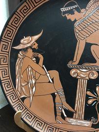 Riproduzione di scena greca su un piatto in terracotta