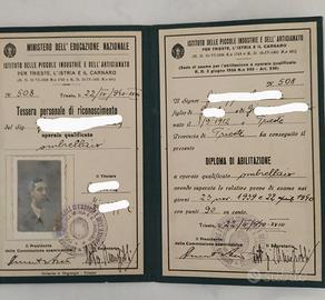 Raro documento d’epoca: Tessera e diploma originale di operaio qualificato ombrellaio, rilasciato dal Ministero dell’Educazione Nazionale – Istituto delle Piccole Industrie e dell’Artigianato per Trieste, l’Istria e il Carnaro, datato 22 aprile 1940.