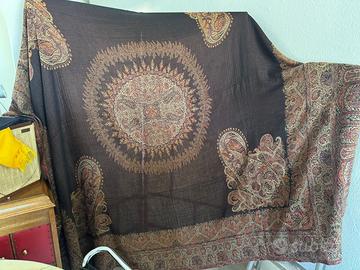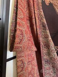 La lana cashmere è nota per la sua estrema morbidezza e qualità, il che suggerisce che questo panno non solo è un pezzo decorativo, ma potrebbe anche essere usato per il suo confort e calore come grande plaid . La frangia sul bordo inferiore aggiunge un tocco finale tradizionale, comune nei tessuti di alta qualità.