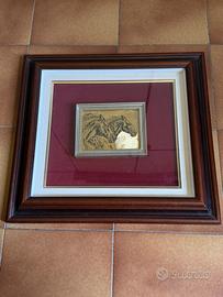 L’opera raffigura due teste di cavalli stilizzate su fondo dorato, con tratto deciso e lineare, ed è completa di cornice doppia, passe-partout bordeaux e certificato di autenticità rilasciato dalla Federazione Nazionale Esperti d’Arte.