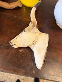 Scultura insegna commerciale pubbliciraria (probabilmente per esposizione macelleria) testa di vacca in legno vintage. H 30 cm x L 18,5 cm.