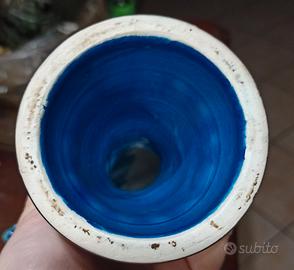 Rara e iconica scultura antropomorfa in ceramica raffigurante il Sole, disegnata dal maestro Aldo Londi negli anni Sessanta per la celebre serie Rimini Blu. Questo esemplare si distingue per la sua forma a "testa" su base cilindrica, decorata con i classici motivi geometrici impressi a mano nella terra cruda e rifinita con lo smalto turchese profondo tipico della manifattura di Montelupo Fiorentino. L'oggetto è in condizioni vintage eccezionali. La struttura è perfettamente integra, i raggi del sole sono tutti presenti e privi di sbeccature (punto solitamente molto critico per questo modello). Lo smalto è lucido e vibrante, con il caratteristico effetto craquelé originale che ne certifica l'epoca e l'autenticità. Il fondo è cavo e rifinito come da produzione standard del periodo. Un pezzo di modernariato di altissimo livello, ideale per collezionisti esigenti o come elemento d'arredo di forte impatto visivo.