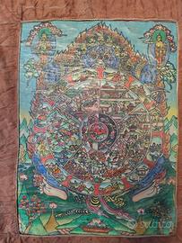 Thangka acquistato in Nepal. Rappresenta la ruota del Dharma, il ciclo dell'esistenza racchiuso dentro un demone e l'invito del Buddha (in alto a destra ) ad uscirne per entrare nella pace del Nirvana ( indicando il santo a sinistra) . Queste tele sono cucite su broccato di seta decorata, ed è il modo in cui vengono incorniciati nella tradizione tibetana, per poter essere appesi o trasportati arrotolati all'occorrenza. Il broccato di seta misura 80 x 50 cm circa, ed il dipinto all'interno 25 cm x 33 cm. Il materiale è tela di cotone, ed i colori sono pigmenti solubili in acqua, sia di minerali che di materiali organici, temperati con una soluzione di erba e colla. Disponibile alla spedizione