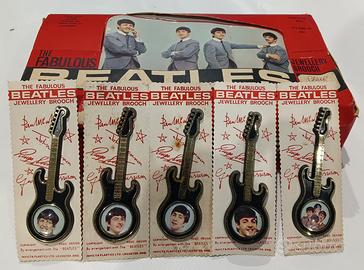 In vendita raro set degli anni '60 “The Fabulous Beatles – Jewellery Brooch”. Il lotto comprende 45 spillette originali totali a forma di chitarra, suddivise in 5 tipologie diverse, ciascuna con l’immagine dei membri dei Beatles (9 spillette per ciascuna tipologia).