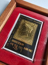 francobollo commemorativo in oro 22 carati emesso dal Bhutan nel 1996. Questo francobollo è una riproduzione del "Penny Black", il primo francobollo adesivo del mondo, emesso dal Regno Unito nel 1840.
