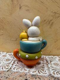 Si tratta di una decorazione pasquale che raffigura un coniglio bianco e un piccolo pulcino giallo che sbucano da una pila di tazzine colorate.