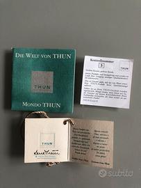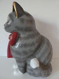 Raro Gatto Thun grigio striato con fiocco rosso e con zampe bianche modello Leonardo. Prodotto da collezione, alla base firma a rilievo Lene Thun degli Anni ‘80.