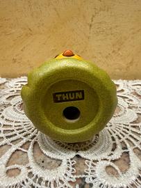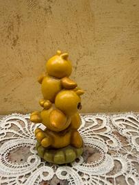 Thun Tre piccoli pulcini impilati l'uno sull'altro a formare un totem, posati su una base che ricorda un nido o delle foglie verdi.
