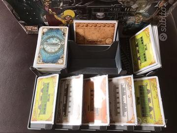 Il vassoio per raccogliere le 5 carte scoperte di ogni turno, il mazzo delle carte coperte, le carte tragitto con le destinazioni da raggiungere e le carte scartate per realizzare le tratte ferroviarie.