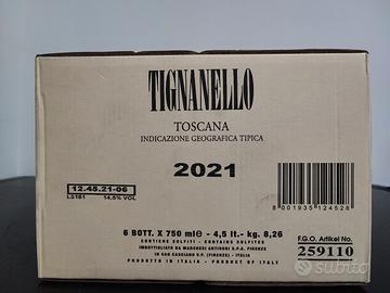 Vendo cartone 6 bottiglie Tignanello 2021. conservato a temperatura e umidità controllata. Spedizione con corriere espresso. Possibilità di ritiro a mano su Roma. In caso di spedizione il cartone verrà aperto e spedito a parte per poter proteggere le bottiglie da eventuali urti dovuti al trasporto.