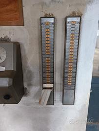 Timbra cartellini Solari Udine in ottimo stato di conservazione completo di chiavetta apertura, l’orologio funziona elettricamente e il timbra cartellino è meccanico; unitamente al timbra cartellini cedo una coppia di porta cartellini in metallo sempre della stessa epoca ancora con alcuni cartellini.
