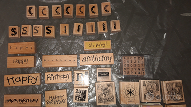 Vendo n. 85 timbri nuovi in legno di vario tipo (anche alcuni in gomma) e 2 confezioni di lettere dell alfabeto in maiuscolo e minuscolo.