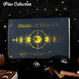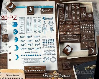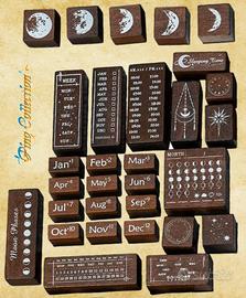 Bellissimo set di timbri in Legno e Gomma stile vintage con Calendario Lunare, Mesi Giorni e Simboli (30 pezzi), racchiusi un una bella scatola.