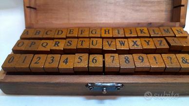 Bellissimo set di timbri in Legno e Gomma stile vintage con Lettere Alfabeto, Numeri e Simboli (42pz), inclusi un una splendida scatola anticata e marcata sul coperchio.