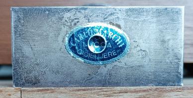 vendo timbro in argento "Carlo Marchi Gioielliere Lucca". Dimensioni: altezza 5 cm, base rettangolare 5 cm x 2.2 cm. Presenta qualche piccola ammacccatura sul pomello. Prezzo: 80 euro