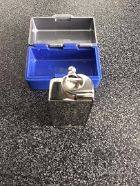 Timer automatico pesante, rettangolare, con cassa in metallo color argento e 2 leve mobili: avvitata al centro in alto c'è una leva con 2 manopole e una base circolare dipinta di rosso. Sulla superficie sotto la leva è incisa una freccia curva e impennata che indica la direzione del movimento. Avvitata sul lato sinistro c'è una leva a forma di freccia con una manopola. Sull'estremità superiore c'è una rientranza concava. Sopra di essa è sospeso un gancio a C fissato a una barra metallica inserita nel corpo del timer. Per impostare il timer, la leva anteriore cerchiata di rosso viene ruotata per attivare il meccanismo interno ed estendere il gancio a C. Per avviare il timer, la leva sul lato della freccia viene spinta indietro e il meccanismo ritrae gradualmente il gancio a C.