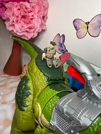 Action figure del Tirannosauro Rex con un personaggio del Fisher Price