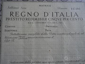 Modulo Nuovo in perfette condizioni di conservazione del 1936 inerente il Prestito redimibile del Regno d'ITALIA- 6 facciate aprentesi a finestra con quietanza, contro-matrice e e matrice. Bellissimo in carta filigranata con impressi i fasci dell'epoca fascista ,la sigla DP (debito pubblico) e testina come da foto . Raro.