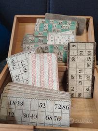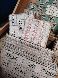 Antiche cartelle della tombola (48 +3+ 47) con numeri ( ne manca 1). NON c'è il cartellone purtroppo.