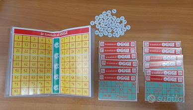 Vendo Tombola vintage del settimanale "OGGI" Sembra una cassetta VHS, ma in realtà è una tombola da viaggio in abbinamento con il settimanale Oggi. Completa di n.1 tabellone, n.12 cartelle e sacchetto con i 90 numeri. Spedisco + s.s.