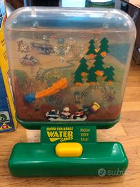 Vendo gioco vintage anni 80, precisamente del 1989 della Tomy modello "WATER GAMES SUPER CHALLENGE ROUGH RIDER RALLY" in ottime condizioni come da foto e completo di scatola. Tappo in gomma per riempimento/svuotamento dell'acqua, integro.