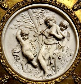 Stupendo tondo bassorilievo realizzato in pasta di marmo raffigurante ALLEGORIA della MUSICA entro cornice francesina in legno dorato e stupende decorazioni in pastiglia dorata perimetrali.