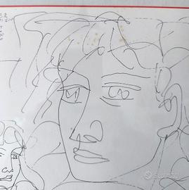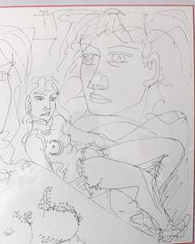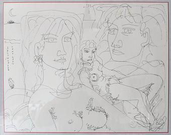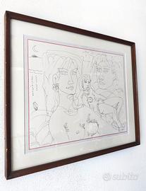 Acquaforte di Tono Zancanaro, caratterizzata da un segno rapido e continuo, quasi “calligrafico”, che costruisce una scena onirica e intimista con figure femminili e maschili sovrapposte, immerse in un’atmosfera sospesa. La composizione, essenziale ma estremamente espressiva, alterna vuoti e tratti sottili, confermando la forza narrativa tipica della grafica dell’artista.