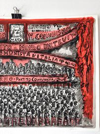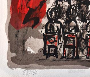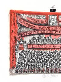 La litografia è dedicata al Congresso di Livorno del gennaio 1921, momento fondativo del Partito Comunista d’Italia, ed è una delle tavole appartenenti alla cartella “6 litografie sulla storia del P.C.I.”. La scena raffigura l’assemblea congressuale come una massa compatta e corale, scandita in registri sovrapposti di figure sedute, dominate dal grande drappo rosso con le scritte “Proletari di tutto il mondo unitevi” e “Partito Comunista d’Italia”. Al centro campeggia il ritratto di Marx, elemento simbolico e ideologico che struttura l’intera composizione. Il segno rapido e nervoso, tipico di Zancanaro, unito alla gamma cromatica ridotta ma fortemente espressiva (rosso, nero e grigi), restituisce una visione epica e militante della nascita del comunismo italiano, in equilibrio tra narrazione storica e forza grafica.