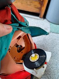 Topolino Mickey Mouse SEBINO Vintage Anni '60/70 - Parlante con Disco Originale Il giocattolo è caratterizzato dal sistema interno a microsolchi: all'interno della schiena è presente un giradischi miniaturizzato che permette a Topolino di parlare. Marca: Sebino (con marchio SIAE sul disco). Accessori inclusi: Disco originale originale "Mickey Mouse" incluso. Condizioni estetiche: Buone per l'età. Il vinile è integro, i vestiti sono quelli originali (mostrano alcuni segni del tempo come da foto). Meccanica: Vano batterie presente. Il meccanismo interno è visibile e sembra completo. Ottima base per un restauro o per esposizione vintage. L'oggetto viene venduto nelle condizioni in cui si trova (visto e piaciuto). È un oggetto dal fascino incredibile, ideale per chi ama il modernariato o i giocattoli meccanici d'epoca.