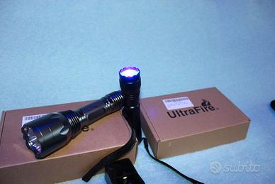Coppia di torce tattiche, UltraFire H-B3 (quella più grossa) e UltraFire WF-501BL PRO (quella più piccola), entrambe luce blu. Complete di una fondina per la torcia più picoola e di una pila con annesso caricatore.