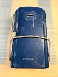 torcia vintage a marchio Wonder, un noto produttore francese di apparecchi d'illuminazione. Periodo: Risalente approssimativamente agli anni '60/'70. Materiale: Corpo in metallo verniciato rosso con lente in plastica trasparente. Design: Presenta la tipica forma piatta con impugnatura a staffa metallica, progettata per essere indossata o appesa. Stato: Oggetto da collezione, iconico per il suo design retro.