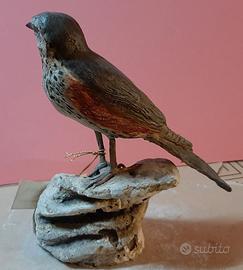 La scultura di un Tordo sassello a dimensioni naturali è stata creata utilizzando una miscela di argilla e cartapesta, con dimensioni di 19 x 8 x 18 centimetri. È stata meticolosamente dipinta con colori acrilici che riproducono in modo fedele le sfumature naturali del Tordo sassello. Gli occhi sono realizzati in vetroresina e presentano una fedele riproduzione del colore dell'iride originale dell'animale. Questa è un'opera unica nel suo genere